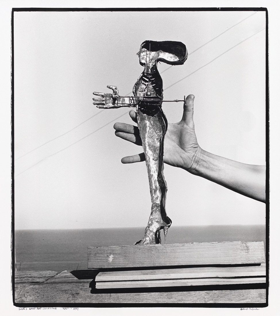 The June Leaf sculpture depicted on this issue’s cover, Shooting from the Heart (1980), lends its title to the Leaf retrospective on view at NYU’s Grey Art Museum through December 13. Photographed here is the artist’s hand by Leaf’s third husband, the Swiss American photographer and documentarian Robert Frank, the 18 × 8 inch figurine—composed of tin plates, rods, spring, and gears—appears both ancient and futuristic, both sleekly high-femme and monstrously composite. There is a