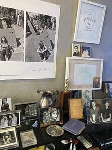 On my dining room wall, mixed with family photos and a blind contour self-portrait by my son Magnus, is a diptych titled “Robert and June in front of 7 Bleecker Street, 1982.” In it, Robert (Frank, famed documentary photographer) looks like a lot of fun. He’s climbing into a giant packing crate on the street to, I assume, make his wife June Leaf and the photographer Brian Graham, his longtime assistant, laugh. June, the artist whose work is featured on the front and back covers, is wrinkled and lithe, sitting on a city sidewalk, folded up like long strong bodies can be, grasshopper-y. Flat sandals, polka dot shirt, jeans, hair loose, genuine smile. Number 7 Bleecker Street is a mottled green two-story building with a steel gate and makeshift curtains blocking the mysteries inside. It is the place where June Leaf, artist and liberated woman, died on July 1, 2024, the very day the kids and I moved into 10 Bleecker across the street.